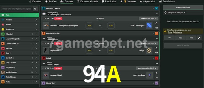 O 94A oferece uma grande seleção de opções de apostas em e-sports com probabilidades competitivas